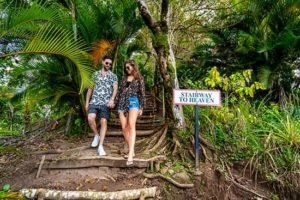 On the Tet Paul Trail: Couples who don’t feel up to summiting the Pitons can get the next best thing on the Tet Paul Scenic Trail, a comparatively easier hike that passes through working farms and traditional island homes on the way to viewpoints with close-up vantages of Mount Gimme, the island’s high point. The roundtrip up the “Stairway to Heaven” to an observation deck proposal can take less than an hour—more if toasts, photos, and kisses are included, of course.